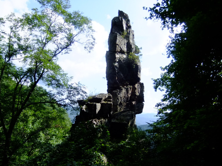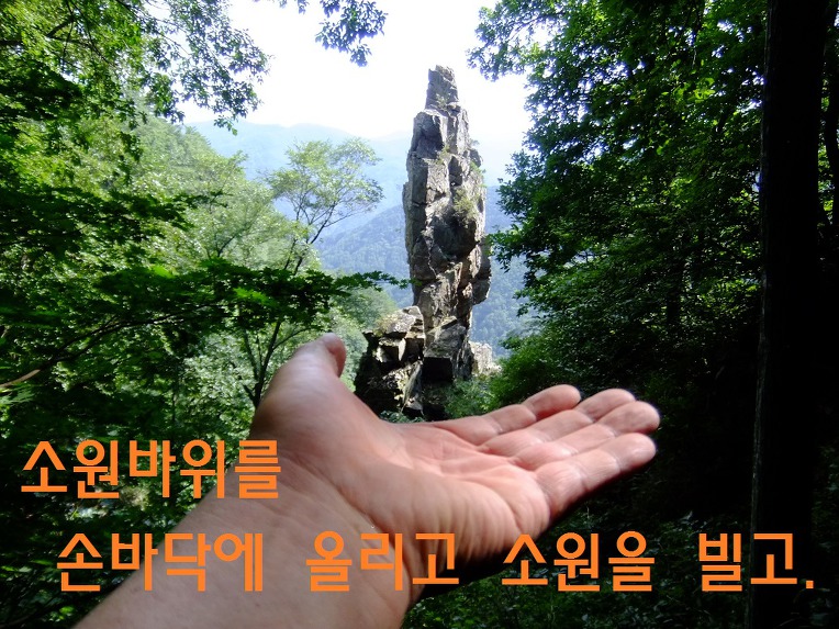 반쟁이골로 내려서다가 소원바위가 없으면 다시 올라 온다는 생각으로 계곡으로 내려서니 잠시 후 계곡 중앙에 하늘을 찌르며 솟구친 바위가 나타나니, 아무런 설명이 없다 해도 사진으로 보았던 소원바위임을 금방 알 수 있었다.