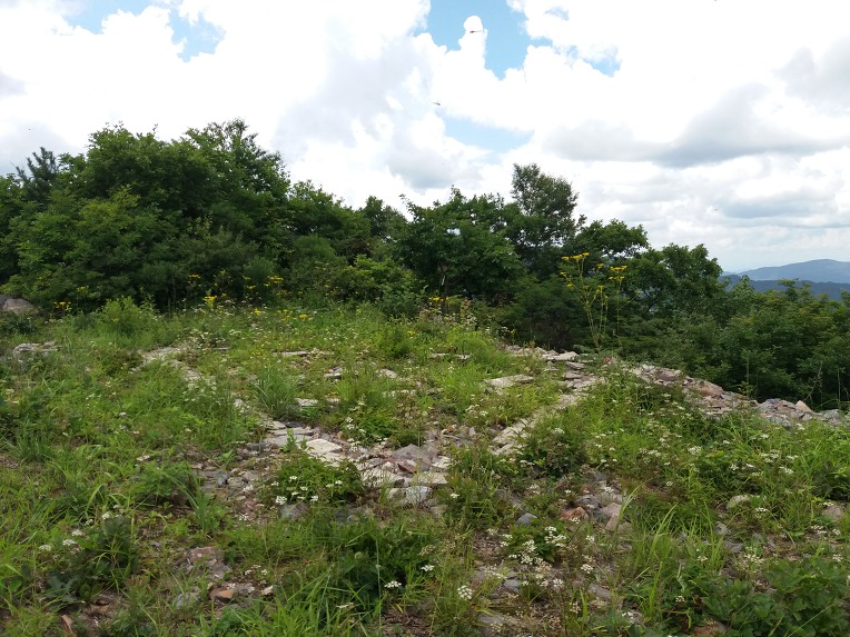 정상으로 올라서자 뜨거운 복사열로 바닥의 박석이 뜨겁게 달구어진 헬기장이 나타났으니 이곳이 순경산 정상이다.
