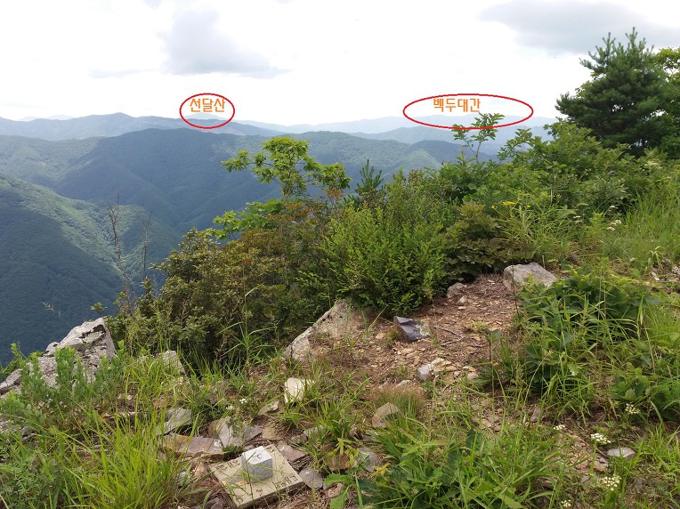 약200여m오르자 전망봉에 올랐는데 함백산-백운산-두위봉으로 이어지는 산릉이 뚜렷하게 눈에 들어오는데 직사광선이 너무 따가워 오래 있을 수 없다.
