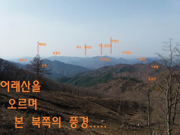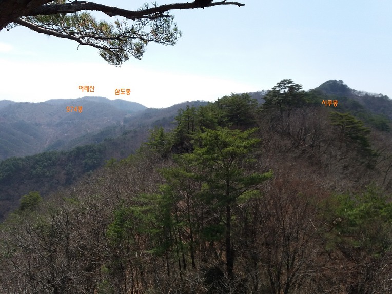 <926봉 정상에서....... 잡목 뒤로는 어래산이 보입니다.>