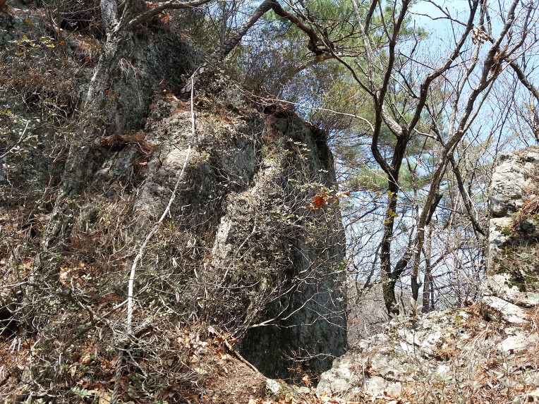 조금전 오르던 바위는 미끄러워서 내려설 수 없고 좌측으로 붙어 나무를 잡고 힘들게 내려선 후 주의를 살피니 좌측으로 내려설 수 있었으며 험한 우회길로 다시 능선으로 올라섰는데 아래서 위를 보니 거대한 암봉이었다.