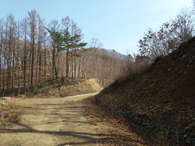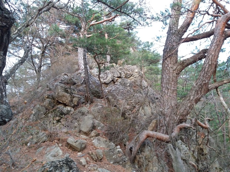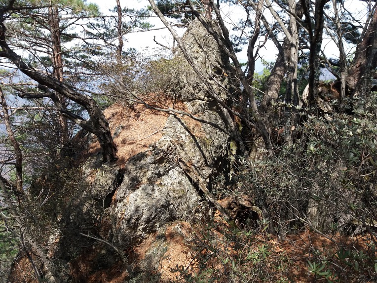능선에 오르니 길은 아주 희미하게 나 있고, 잡목은 많았는데 대부분 진달래나무였는데 이리 저리 나무를 헤치며 갈만했다.
