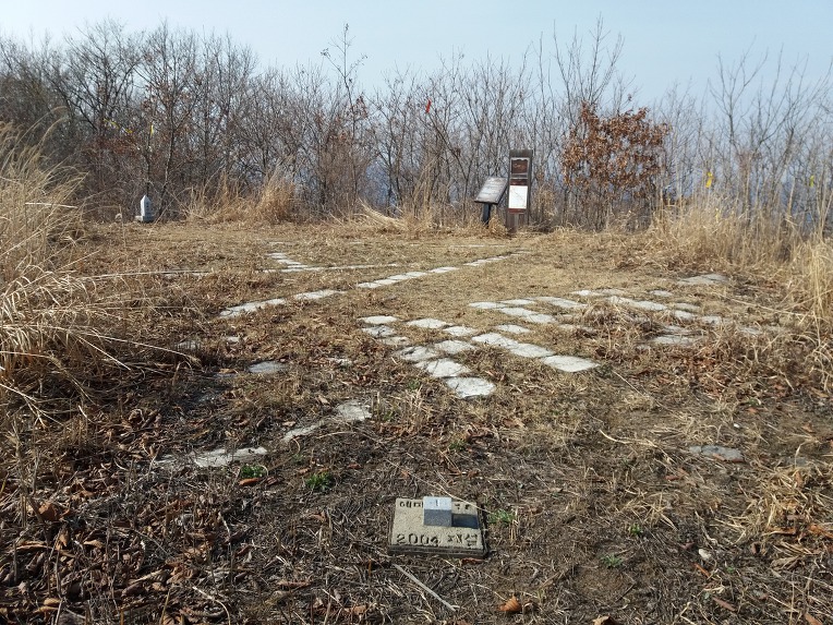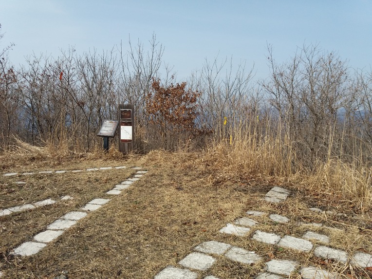 정상을 중심으로 잡목이 사방을 막고 있어 조망은 전혀 없으나 조금 전 산판지역에서 최고의 조망을 즐겼으므로 문제가 없었으며 이곳부터 영월 외씨버선길이라는 영월둘레길이 있어 곳곳에 안내판과 표지기를 달아 놓아 길 잃을 염려는 없다.