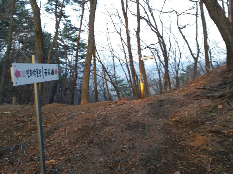 855봉을 넘어 내리막으로 급히 내려서며 안부에 도착하는데 안부에는 곰봉↔민화박물관 안내판이 세워져 있고 곰봉0.8km 이정표가 있는 것을 보고 내려서자마자 바로 민화박물관 방향인 좌측으로 내려선다.