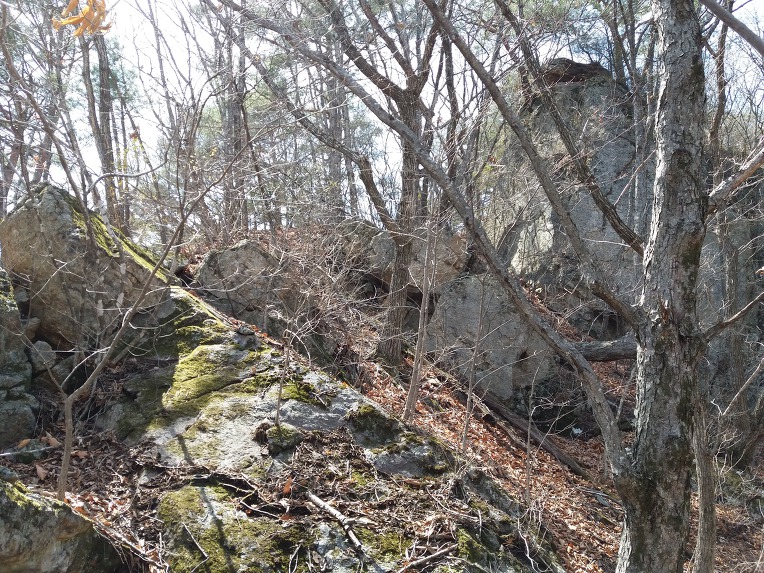 <정상을 내려선 지점 등로 옆에 큰 입석을 지납니다.>