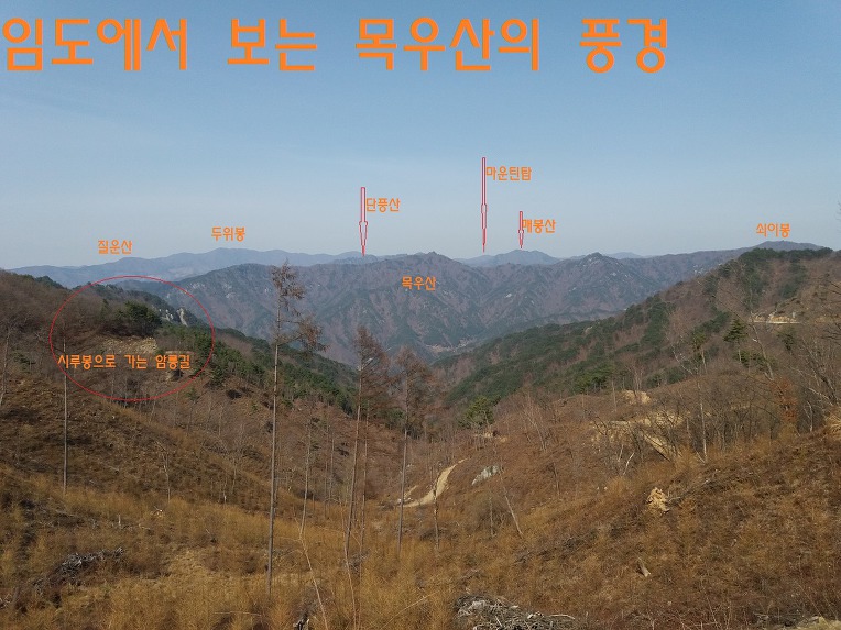 옥동천 우측으로 목우산과 쇠이봉의 긴 능선이 구룡산에 닿고, 목우산정상 너머로 단풍산이 보이며 구룡산 우측으로 백두대간 능선에는 옥석산이 살짝 보이고 선달산과 이어서 남쪽 방향으로 내려서며 어래산과 시루봉이 모습을 드러낸다.