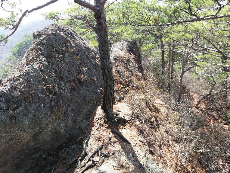 암릉과 잡목을 헤치며 이어가는 등로에는 아름드리 소나무가 이어지기 시작했고 20분을 지나 색바란 표지기를 볼 수 있었는데 길이 험한 코스여서인지 최근 단 표지기는 볼 수 없었다.