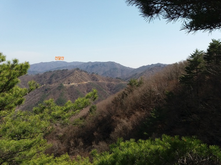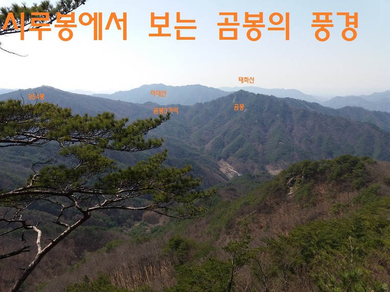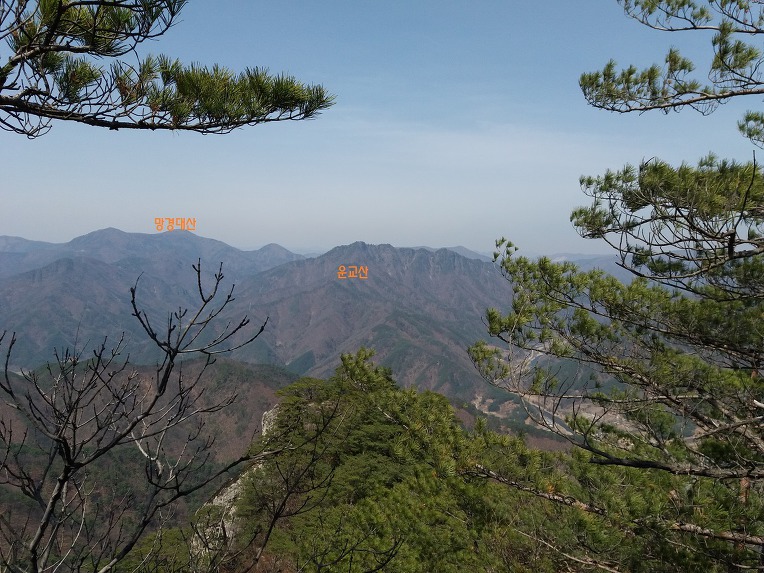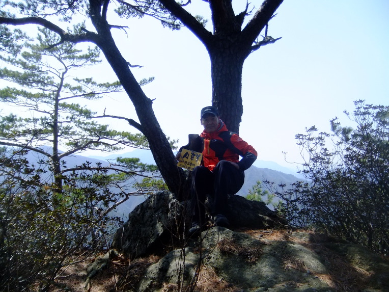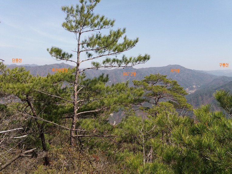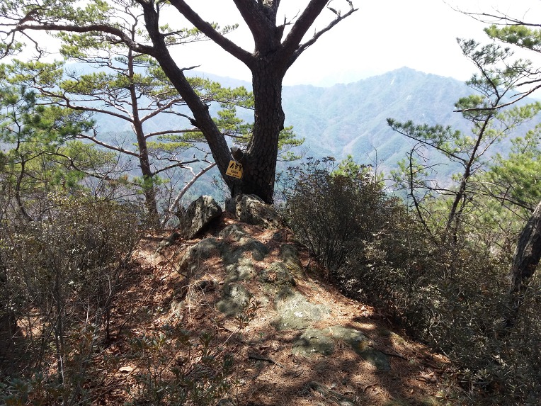 어차피 어렵게 올라섰으므로 조망을 한다는 생각에 정상으로 오르니 소나무 거목이 죽은 채로 방치되어 있는 곳이고 한 쪽에는 암릉 낭떠러지기로 조망에는 소나무 가지가 조금은 방해가 되기는 하지만 그런대로 좋은 편이었다.