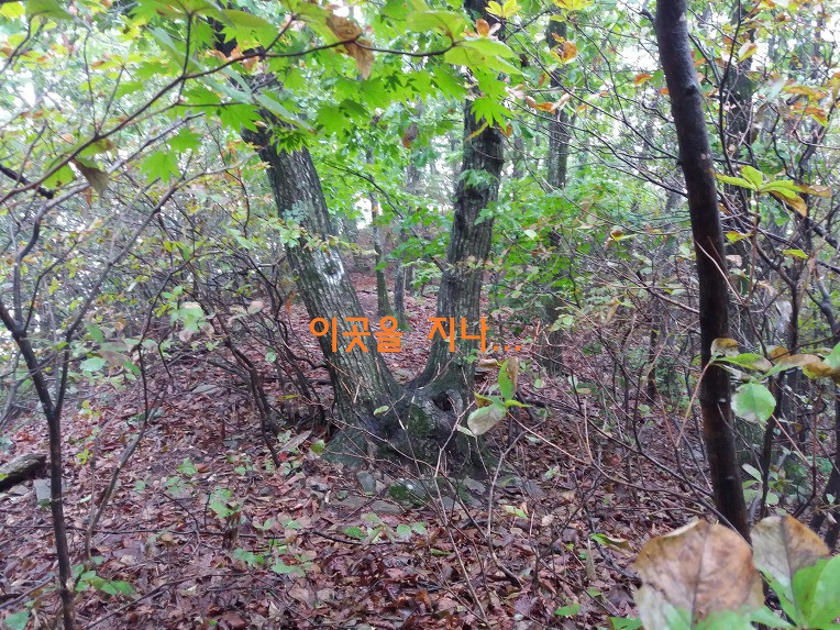보리솟골 3거리를 지나면 잡목이 있는 능선을 지나게 되는데 조금전에 멈추었던 빗방울이 다시 떨어지기 시작하니 마음은 급하고 불안하기만 하였고 마음속으로 비가 그치기를 바라며 능선을 이어가다보니 비는 잠시 후 그치고 나뭇잎에 떨어진 빗물로 말라가던 바지는 3번째 흥건하게 젖어든다.