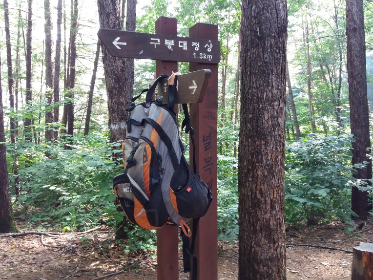 계류를 건너는 곳은 물이 많아 스틱으로 짚어가며 징검다리를 조심스럽게, 어느 때는 우악스럽게 건너기를 3차례, 임도 갈림길에 서낭당을 방불케 하는 지저분한 표지기가 걸린 곳에 이정표(구봉대정상3km↔법흥사입구0.5km)를 만난다.