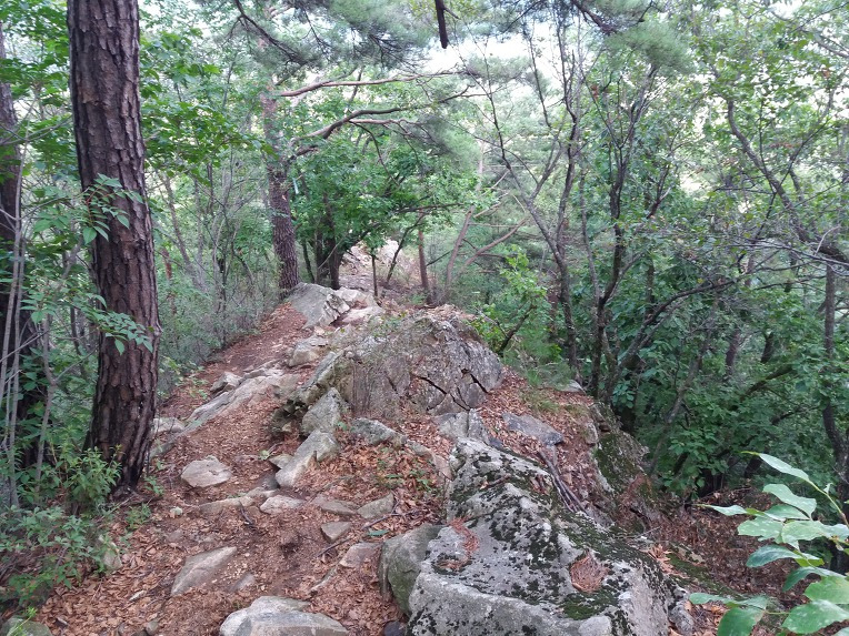 한동안 내리막으로 내려서던 등로는 서서히 암릉 오르막으로 바뀌고 온몸에서는 비 오듯 땀이 흐르지만 계속 속도를 내며 능선을 이어간다.