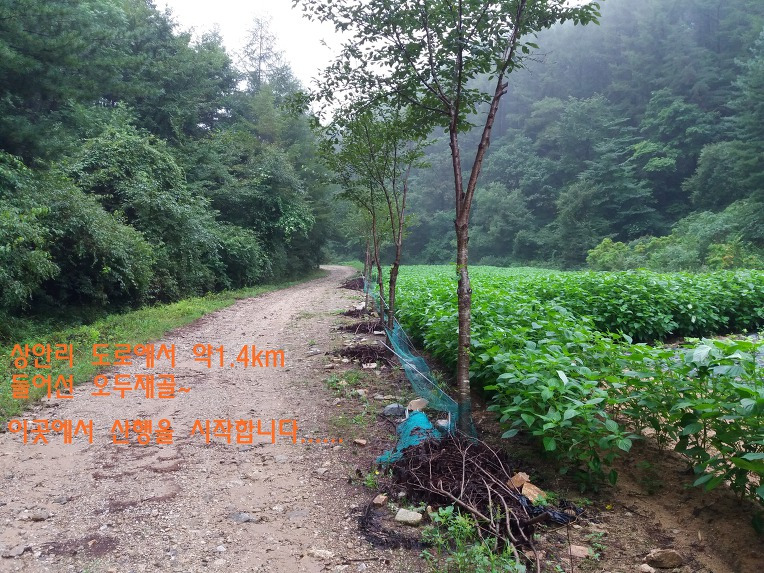 그래서 민가가 있는 곳에서 내리며 만원을 지불하긴 했는데 포장도로3km, 비포장도로1.4km를 가고 만원을 지불하려니 억울한 생각이 들었지만 잊고 산행을 하기위해 산행채비를 합니다.