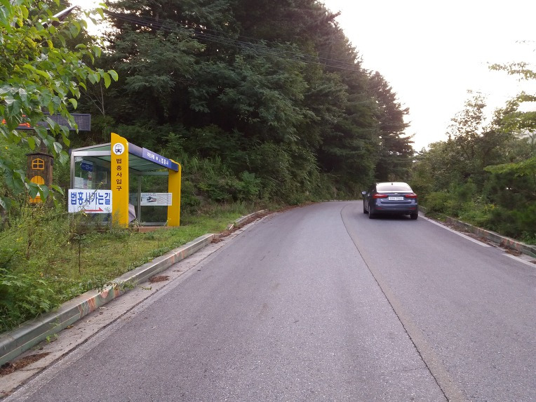 이제 안심을 하며 포장길을 따라 터벅거리며 내려서니 구봉산장 날머리로 법흥사입구 정류장이 있다.