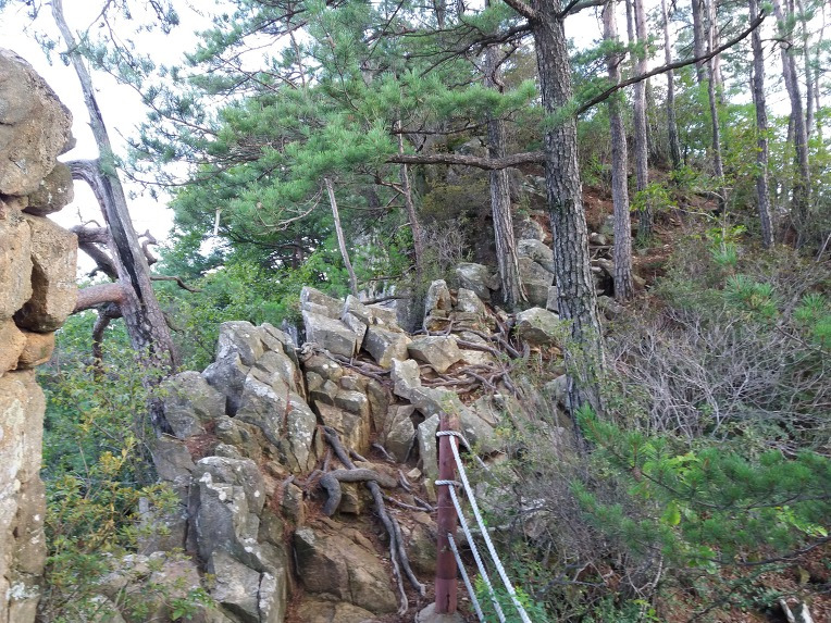 <윤회봉에서 이어지는 암릉으로 길은 매우 거칠고 위험합니다.>